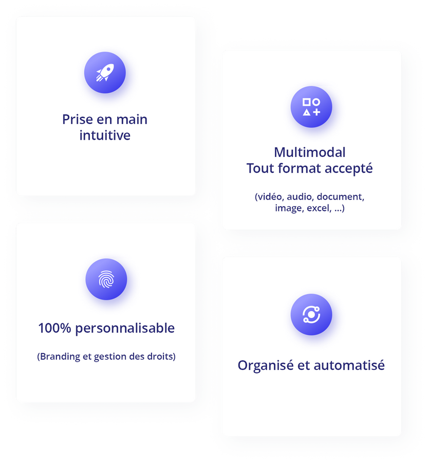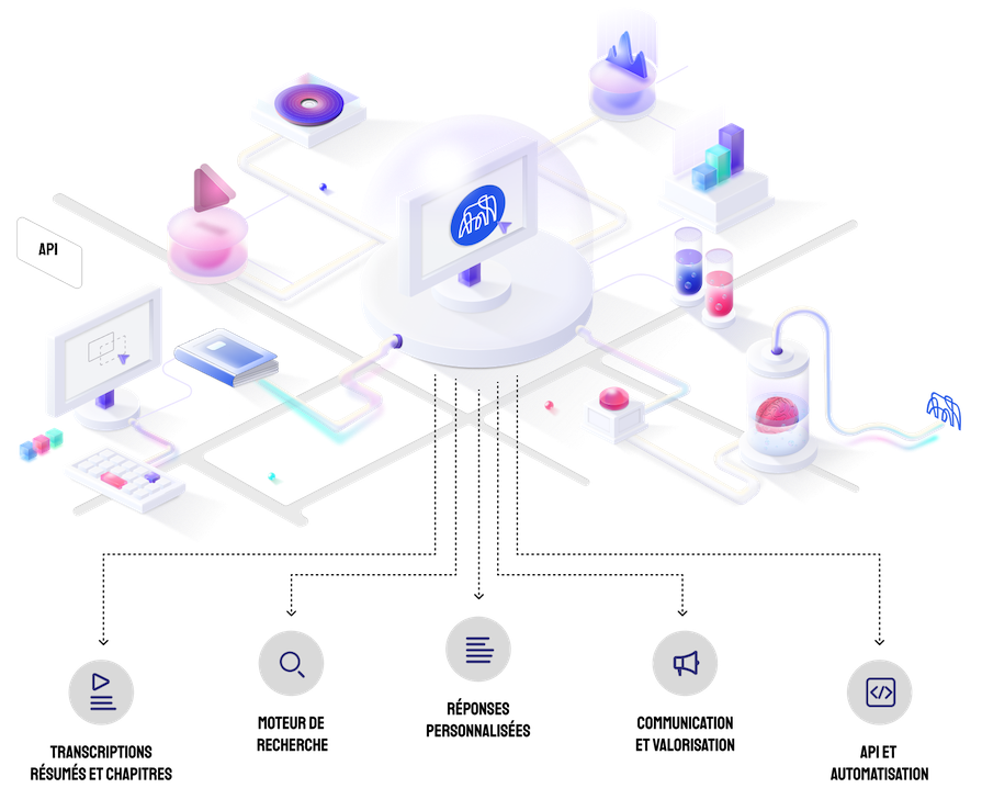 Avec l'aide de Memory IA, un ensemble d'éléments comme des chapitres et des résumés sont générés pour les vidéos et audios (via une transcription automatique "Speech To Text") ainsi que pour les documents .